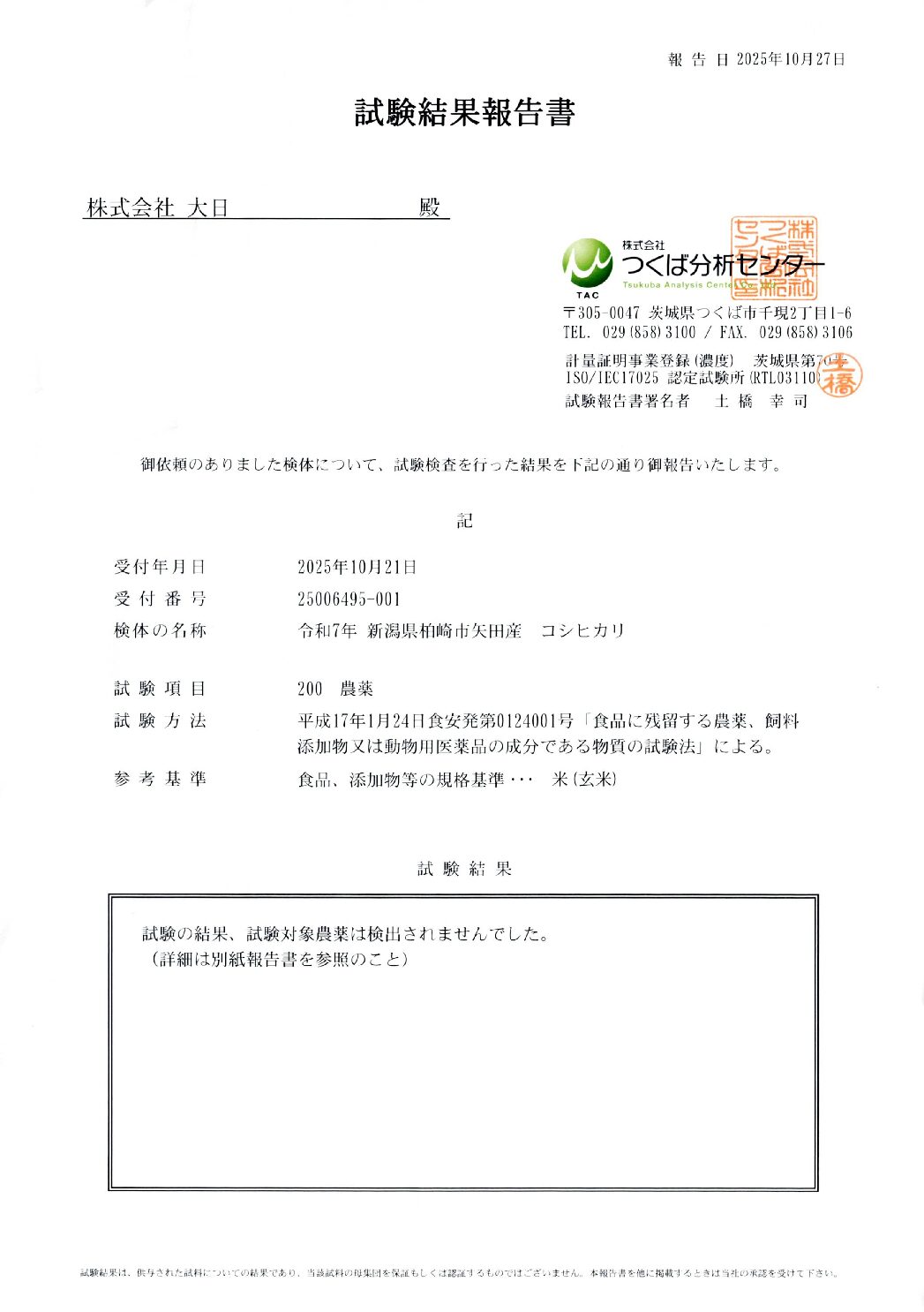 2025年 品質評価資料及び残留農薬検査結果報告書